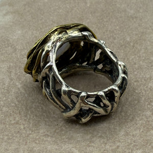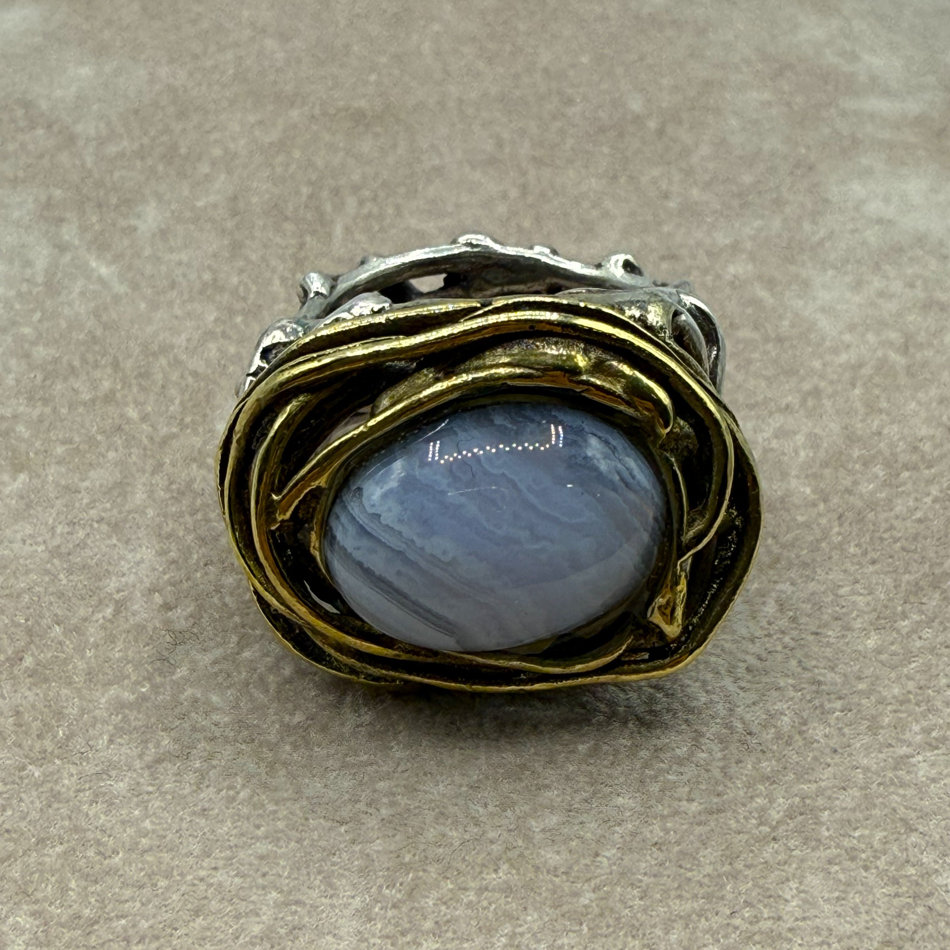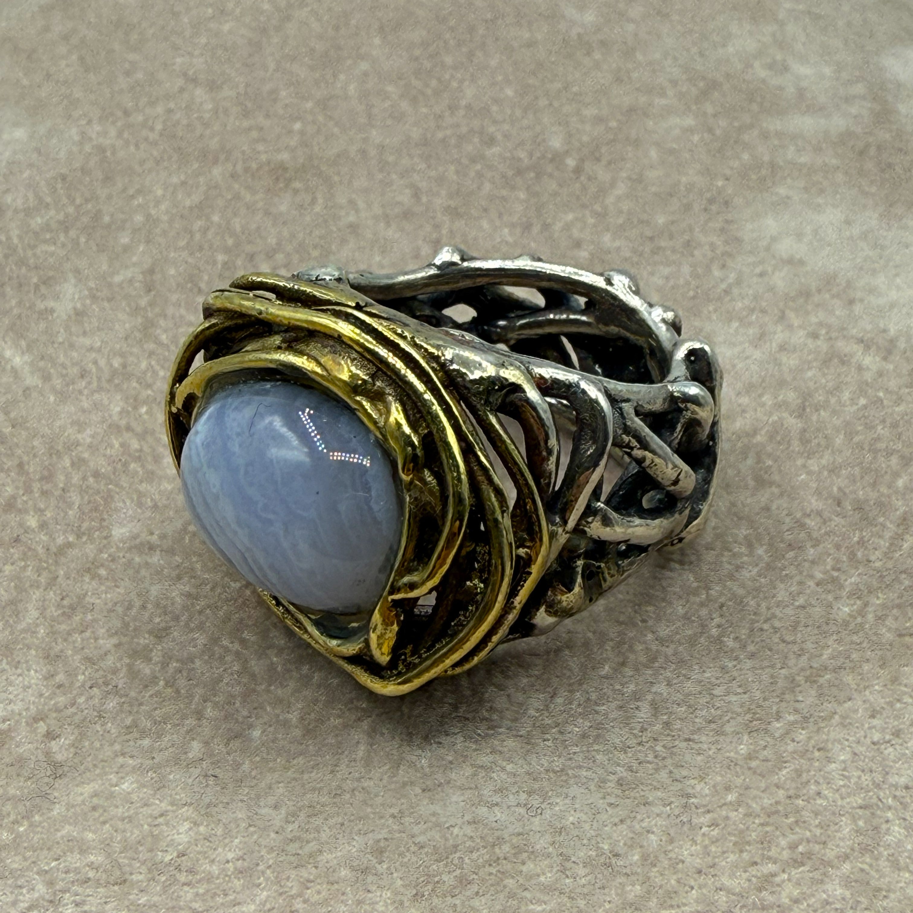 Anello in argento 925 creato mediante lavorazione artigianale con agata blu centrale di notevole impatto visivo. Realizzato interamente a mano secondo i metodi orafi tradizionali, ogni esemplare presenta caratteristiche uniche e garantisce una qualità costruttiva superiore. L'agata blu, magistralmente montata, costituisce l'elemento dominante che esalta la luminosità dell'argento puro. Perfetto per chi ricerca autenticità nella lavorazione manuale e desidera un pezzo che unisca eleganza estetica a solidità strutturale. Un anello che incarna l'eccellenza artigianale e la sofisticatezza del design senza tempo.