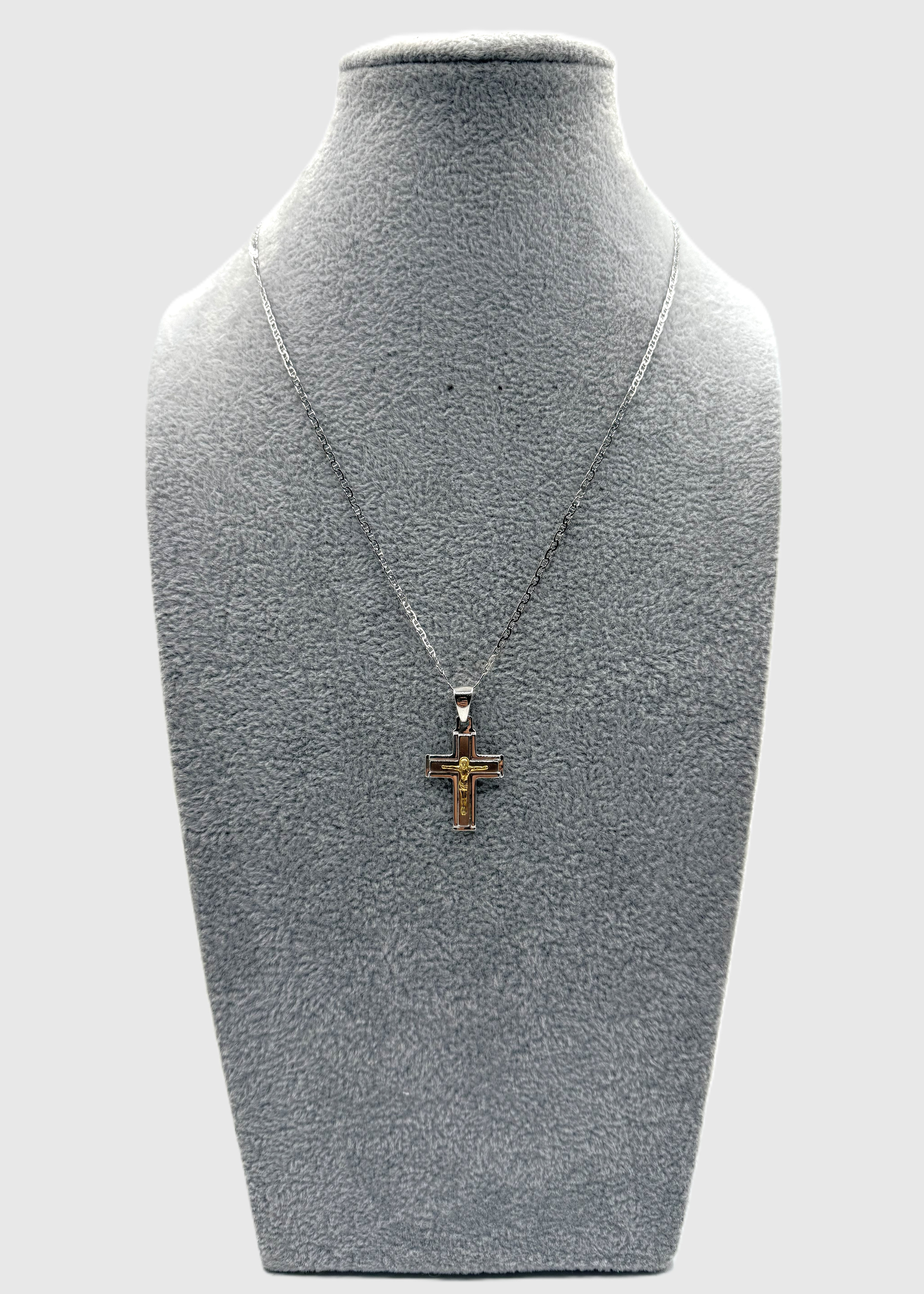 Elegante collana in argento 925 combinato con oro, arricchita da un raffinato ciondolo a forma di crocifisso. Questo pezzo rappresenta un'armoniosa fusione di materiali nobili, ideale per chi ricerca gioielli dal significato spirituale e dal design sofisticato. La lavorazione accurata garantisce durabilità e brillantezza nel tempo. Perfetto come regalo significativo o come accessorio personale che unisce fede e stile.