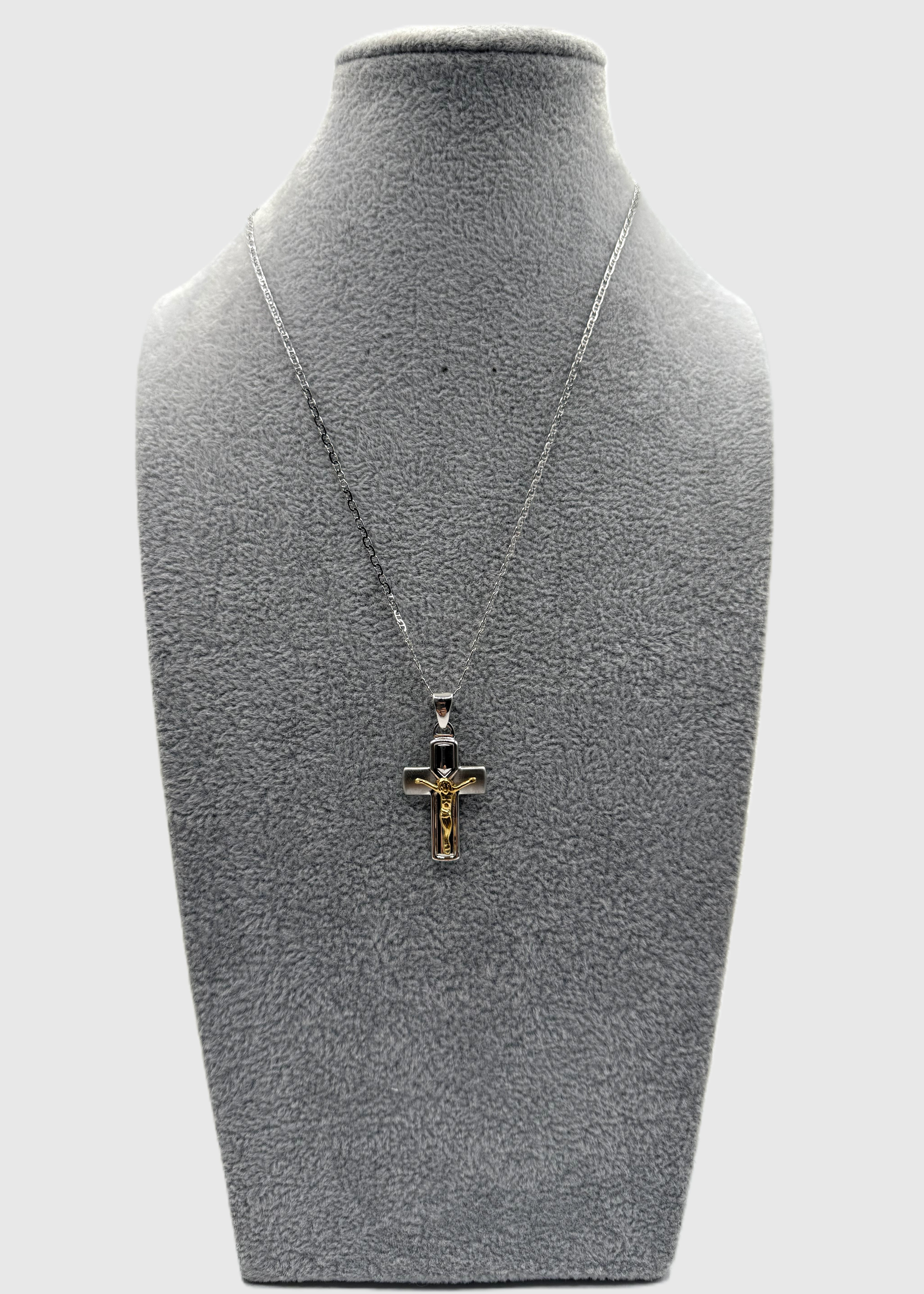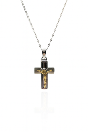 Elegante collana in argento 925 combinato con oro, arricchita da un raffinato ciondolo a forma di crocifisso. Questo pezzo rappresenta un'armoniosa fusione di materiali nobili, ideale per chi ricerca gioielli dal significato spirituale e dal design sofisticato. La lavorazione accurata garantisce durabilità e brillantezza nel tempo. Perfetto come regalo significativo o come accessorio personale che unisce fede e stile.