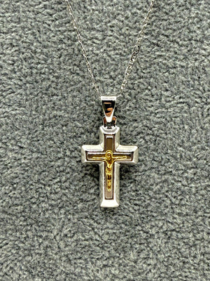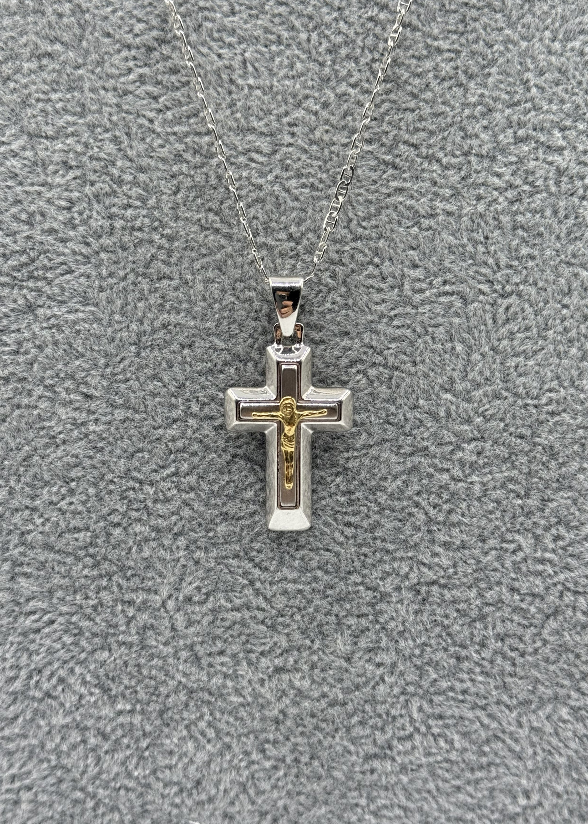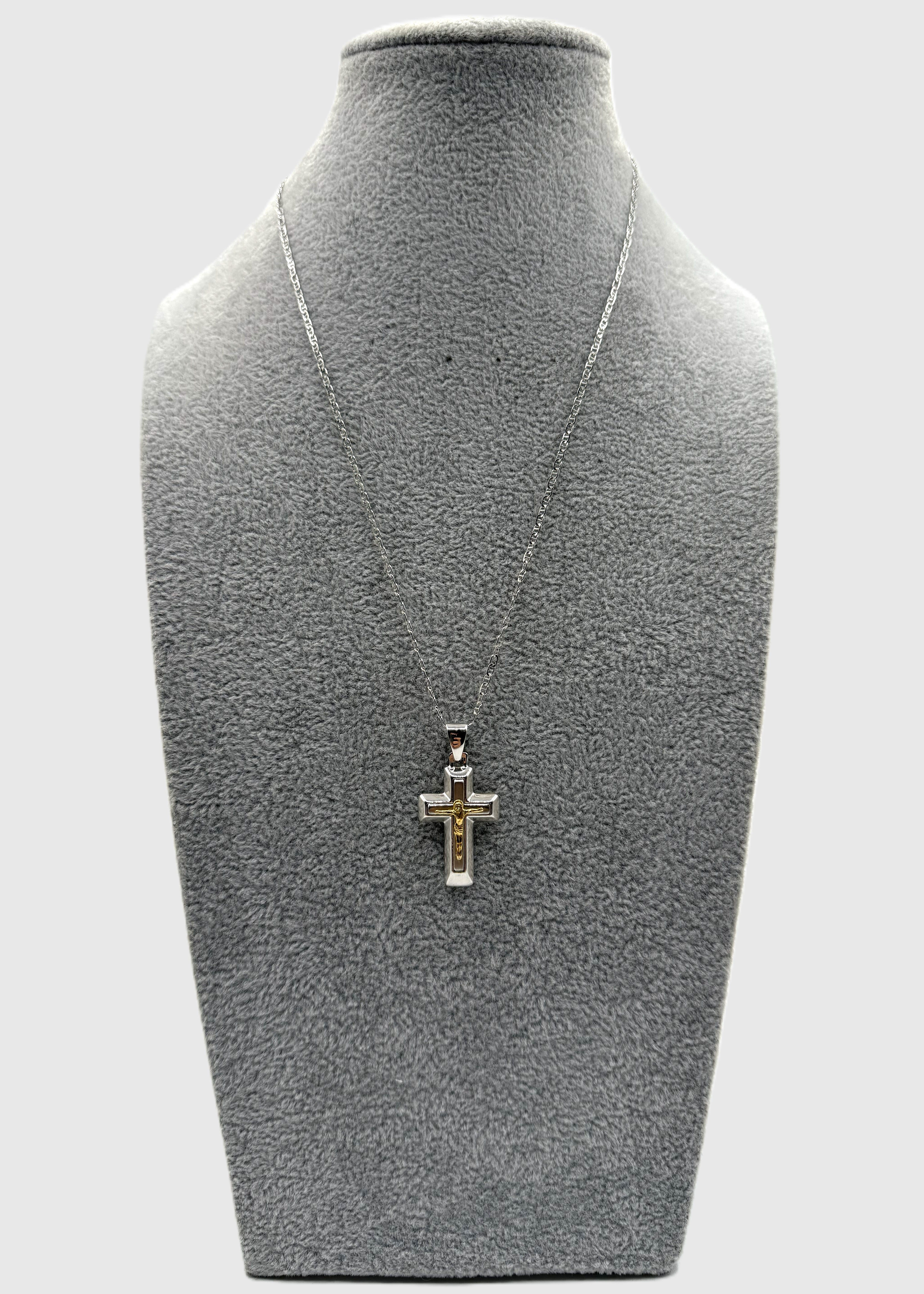 Elegante collana in argento 925 combinato con oro, arricchita da un raffinato ciondolo a forma di crocifisso. Questo pezzo rappresenta un'armoniosa fusione di materiali nobili, ideale per chi ricerca gioielli dal significato spirituale e dal design sofisticato. La lavorazione accurata garantisce durabilità e brillantezza nel tempo. Perfetto come regalo significativo o come accessorio personale che unisce fede e stile.