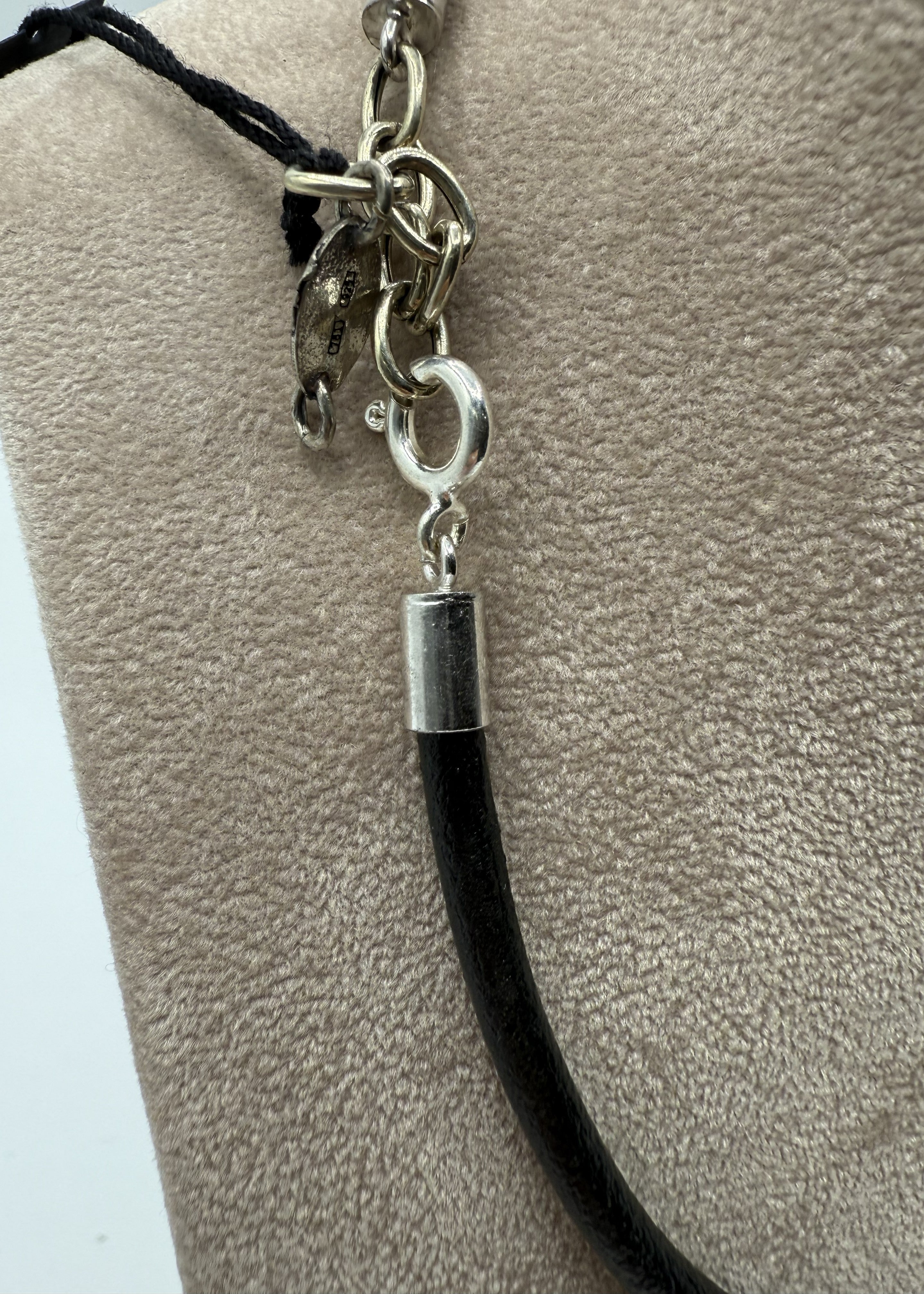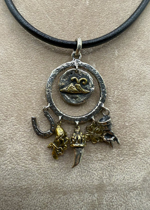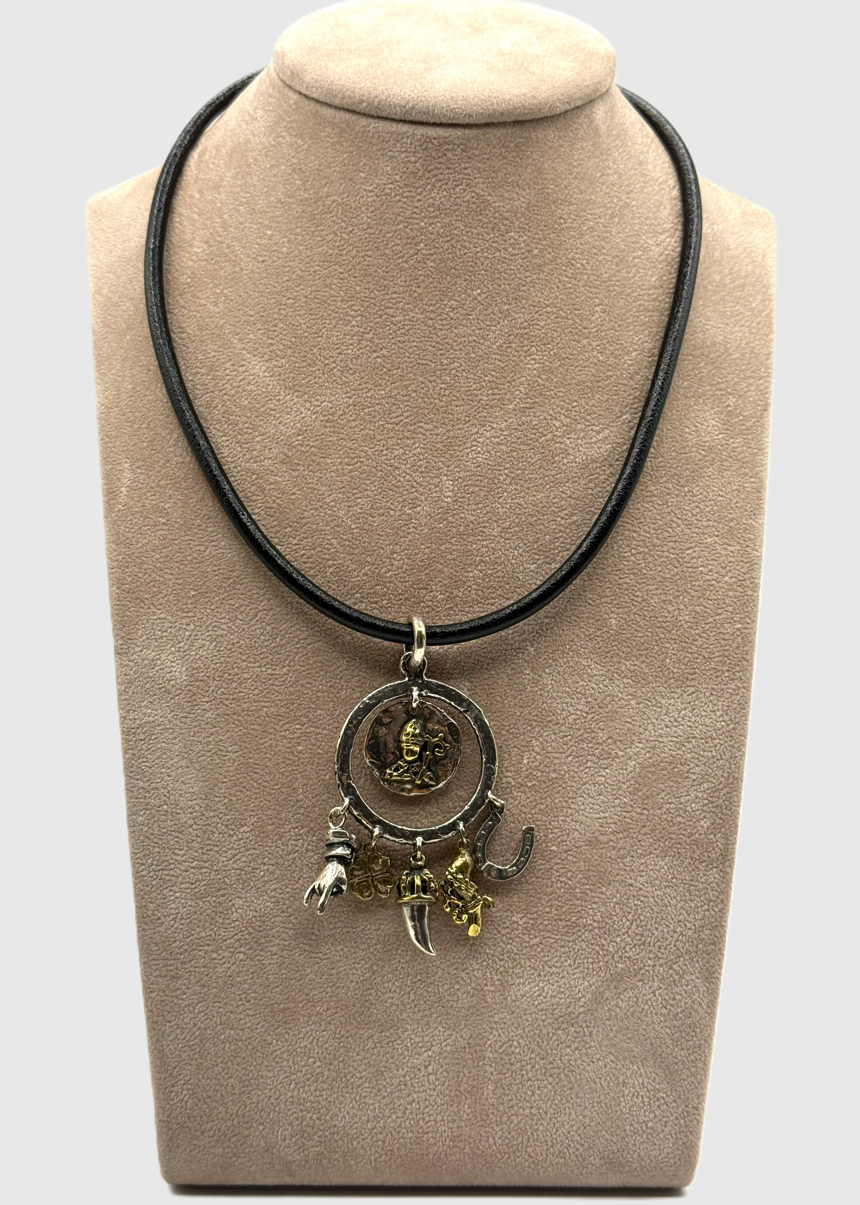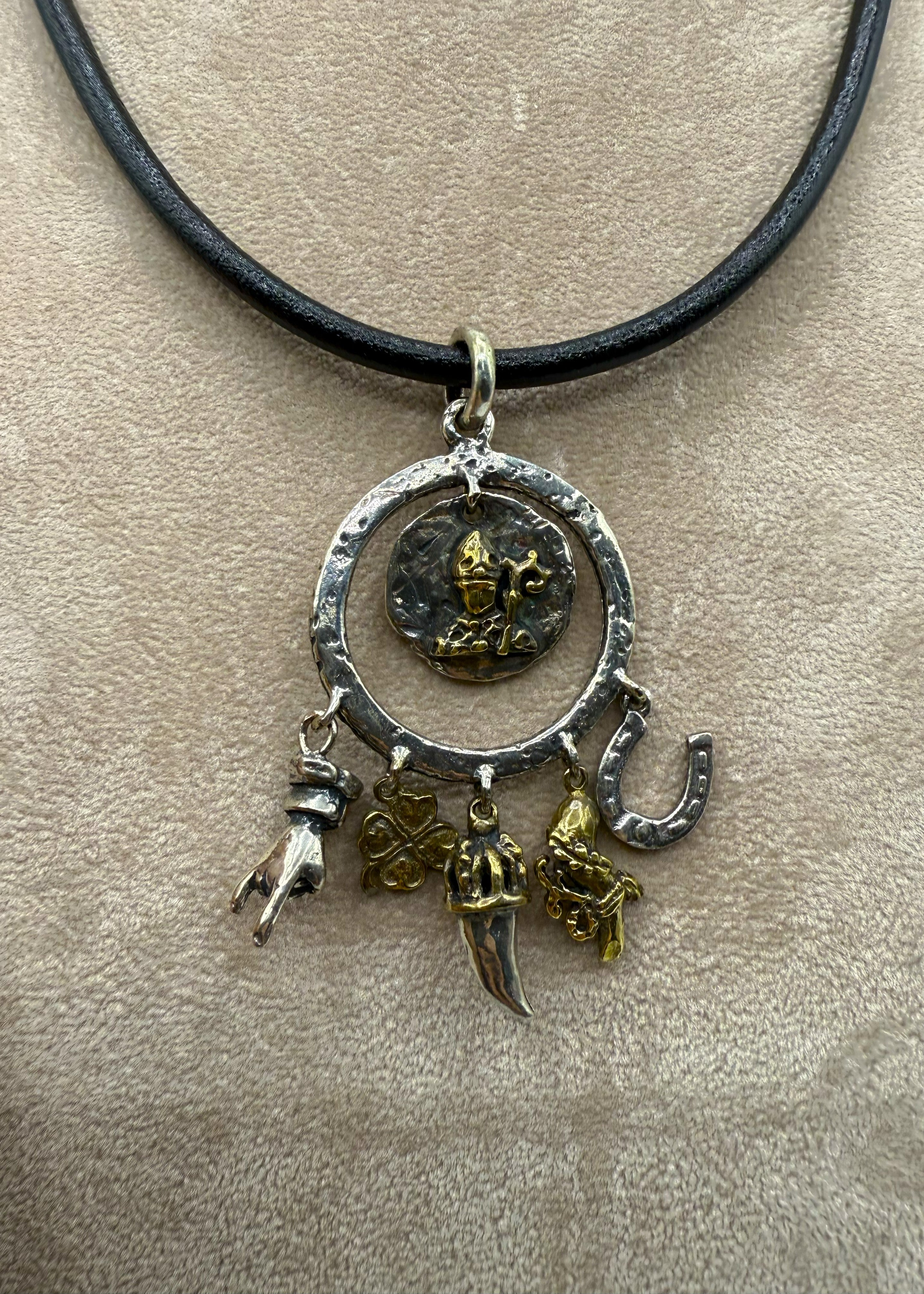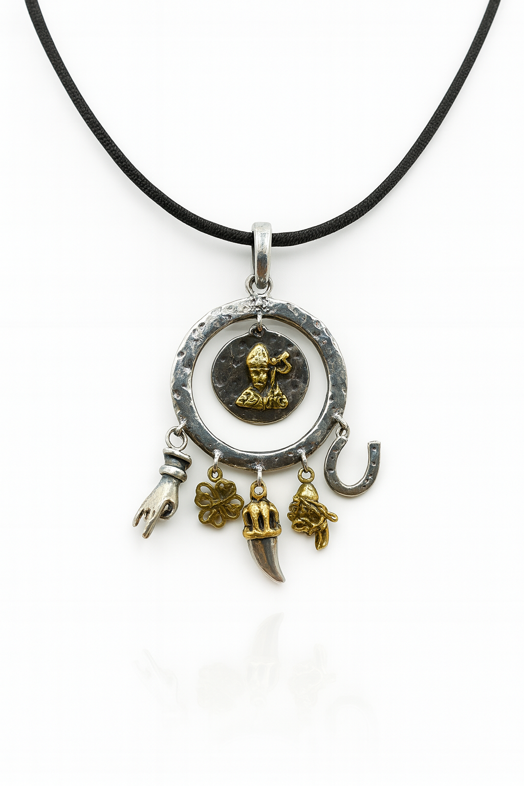 Collana in argento 925 con pendente a doppia faccia raffigurante il Vesuvio e San Gennaro, arricchita da charms portafortuna che amplificano il valore simbolico. Ogni pezzo è lavorato artigianalmente con precisione, garantendo unicità e qualità superiore. L'argento sterling mantiene nel tempo una brillantezza naturale e una solidità affidabile. Questa creazione incarna la ricchezza spirituale napoletana, permettendoti di portare con te protezione e benedizione attraverso molteplici simboli. Un gioiello pensato per chi ricerca profondità culturale e desidera celebrare le proprie radici con eleganza consapevole e significato autentico.