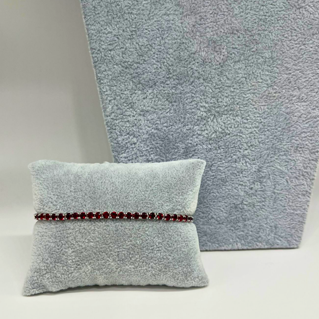 Questo affascinante bracciale presenta una serie di zirconi rossi incastonati su una base argento scintillante, creando un effetto luminoso e vivace.